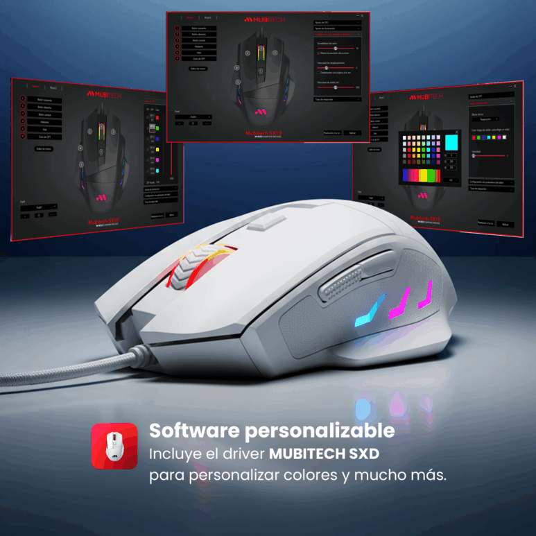 Personaliza los 7 efectos RGB con el SOFTWARE MUBITECH SXD, que además te permite grabar MACROS y guardar hasta 3 PERFILES ONBOARD. Todo esto y mucho más con el Software para PC incluido.
